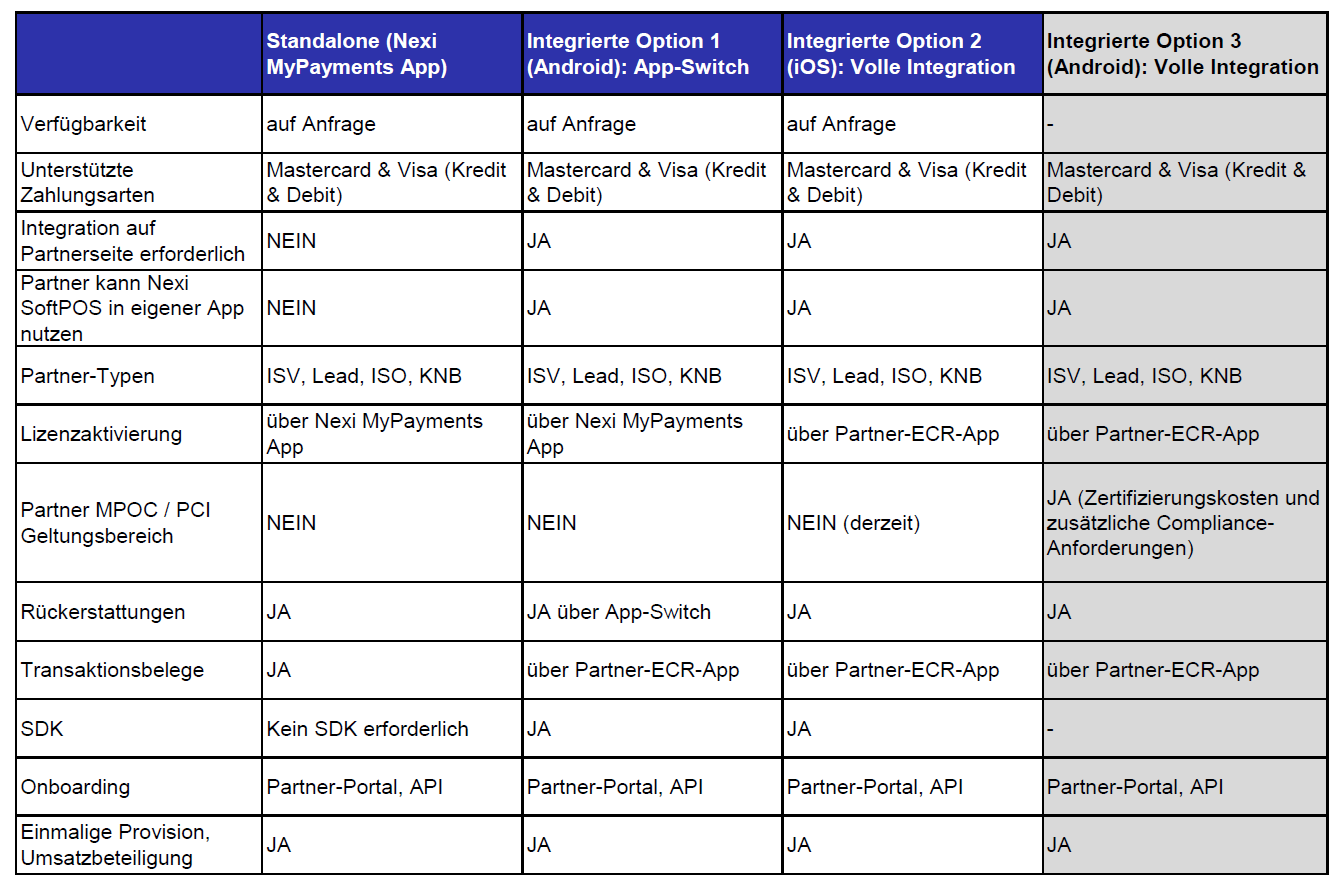 COTS-Geräte – sowohl iOS als auch Android – werden unterstützt, sofern die allgemeinen Anforderungen für Nexi SoftPOS (siehe oben) sowie die spezifischen Anforderungen für jede Plattform erfüllt sind.